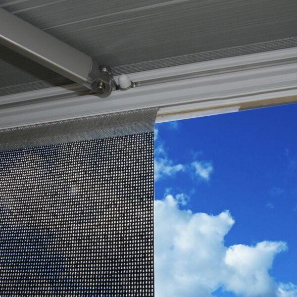 - Auch kann eine vertikale Sonnenblende oder vertikaler Windschutz prima mit CLEVER CLIPS an der Markise befestigt werden, zusammen mit unseren MUFU Aufhänger, der im Schlitz der Markise passt.